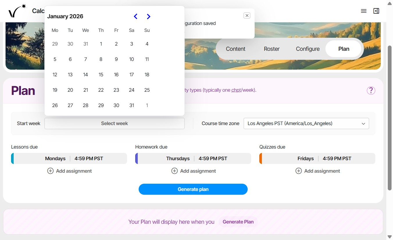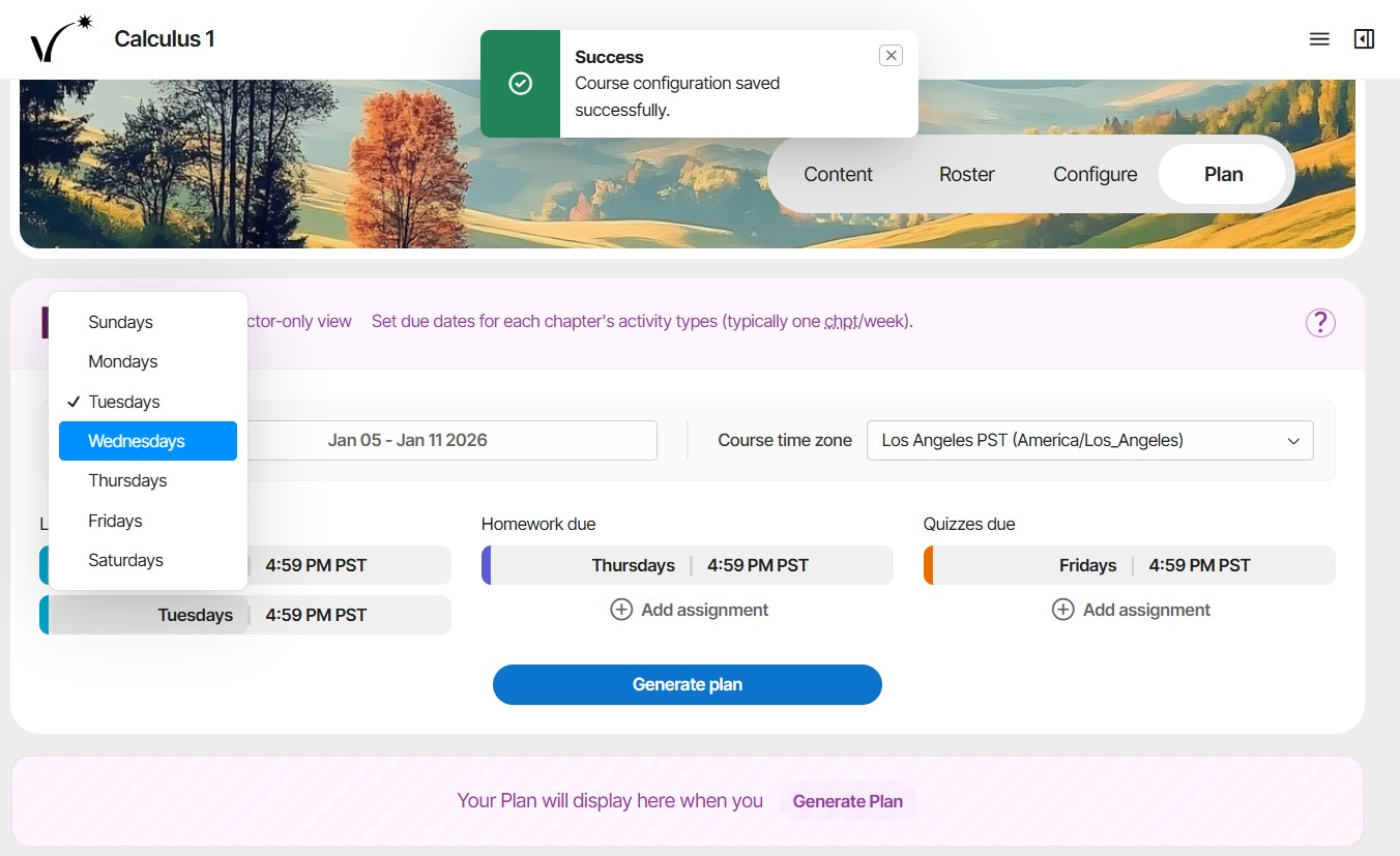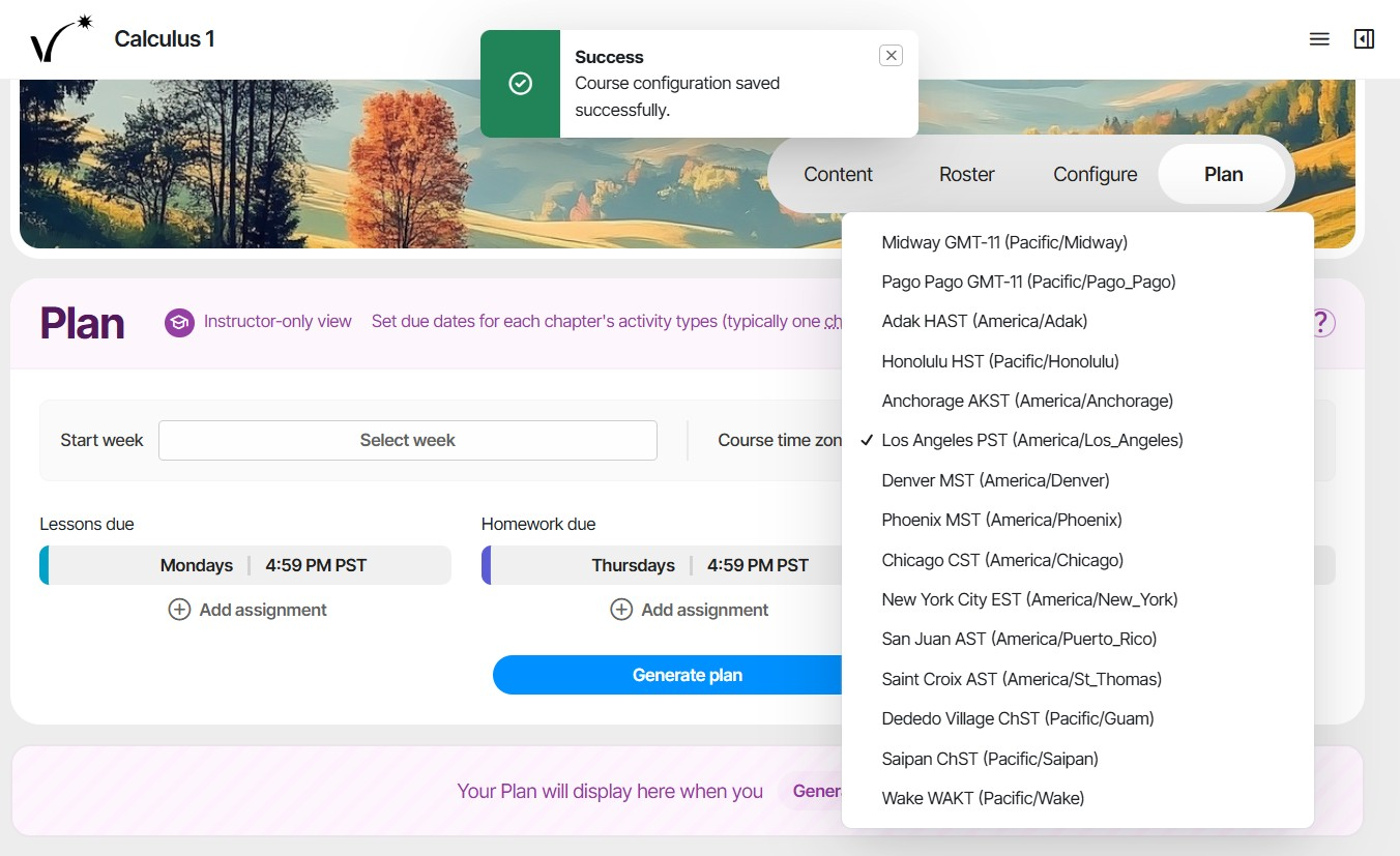 - Select weekly due dates and times for lessons, homeworks, and quizzes.