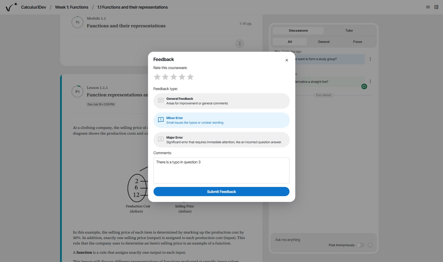 - Minor error: Use this to report small typos or other errors that don't prevent students from completing work but should be fixed. Staff aims to correct within 1-2 weeks (often faster).