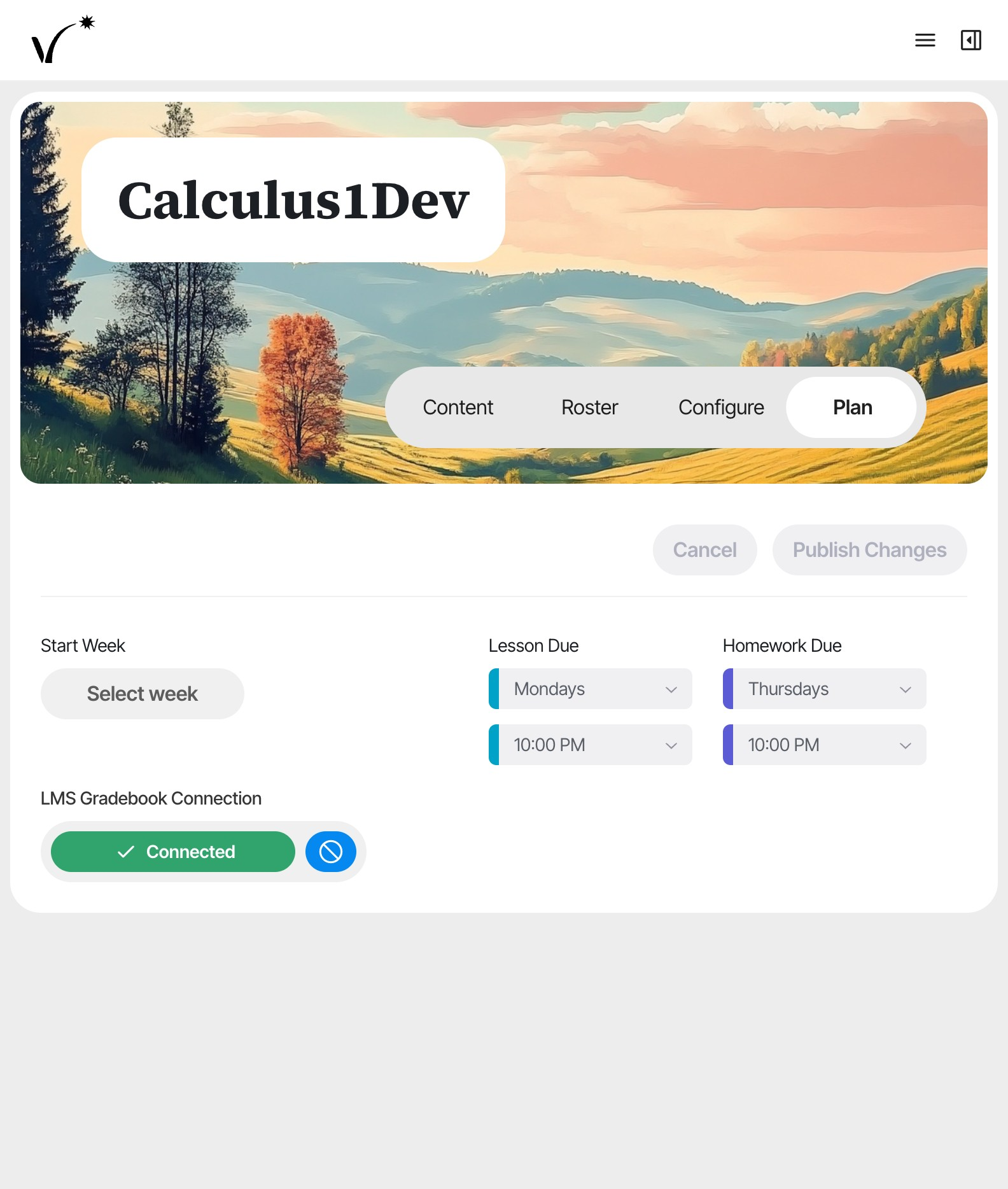 1. From the "Plan" page, click the "Connect" button under "LMS Gradebook Connection" to connect the courseware with your Learnvia Canvas course Gradebook. Once connected, the button will turn green and read "Connected".