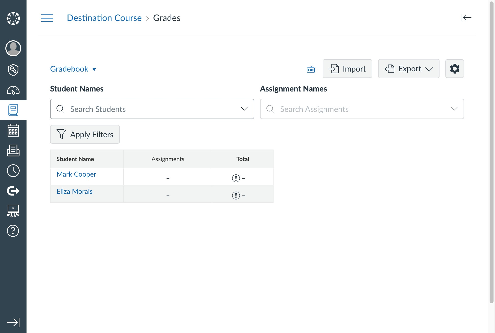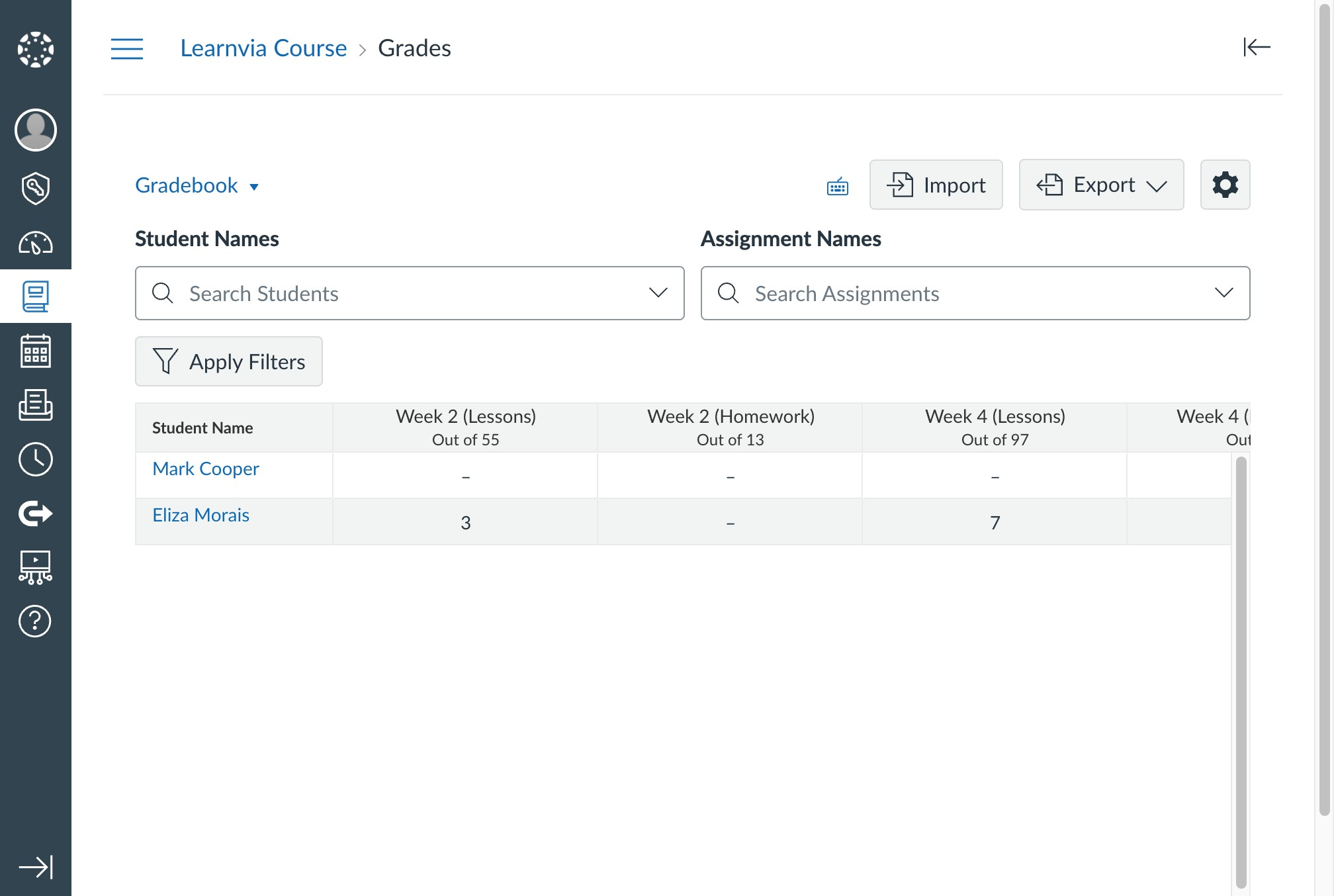 Your Gradebook will now show all of the assignments and grades that you exported from your Learnvia Canvas course.
