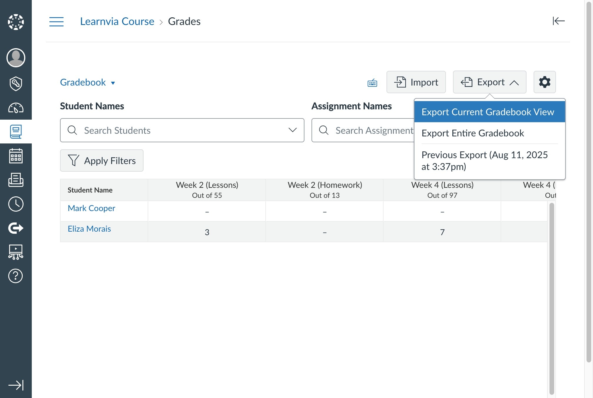 2. In your Learnvia Canvas course, navigate to the Gradebook. Click the "Export" button.