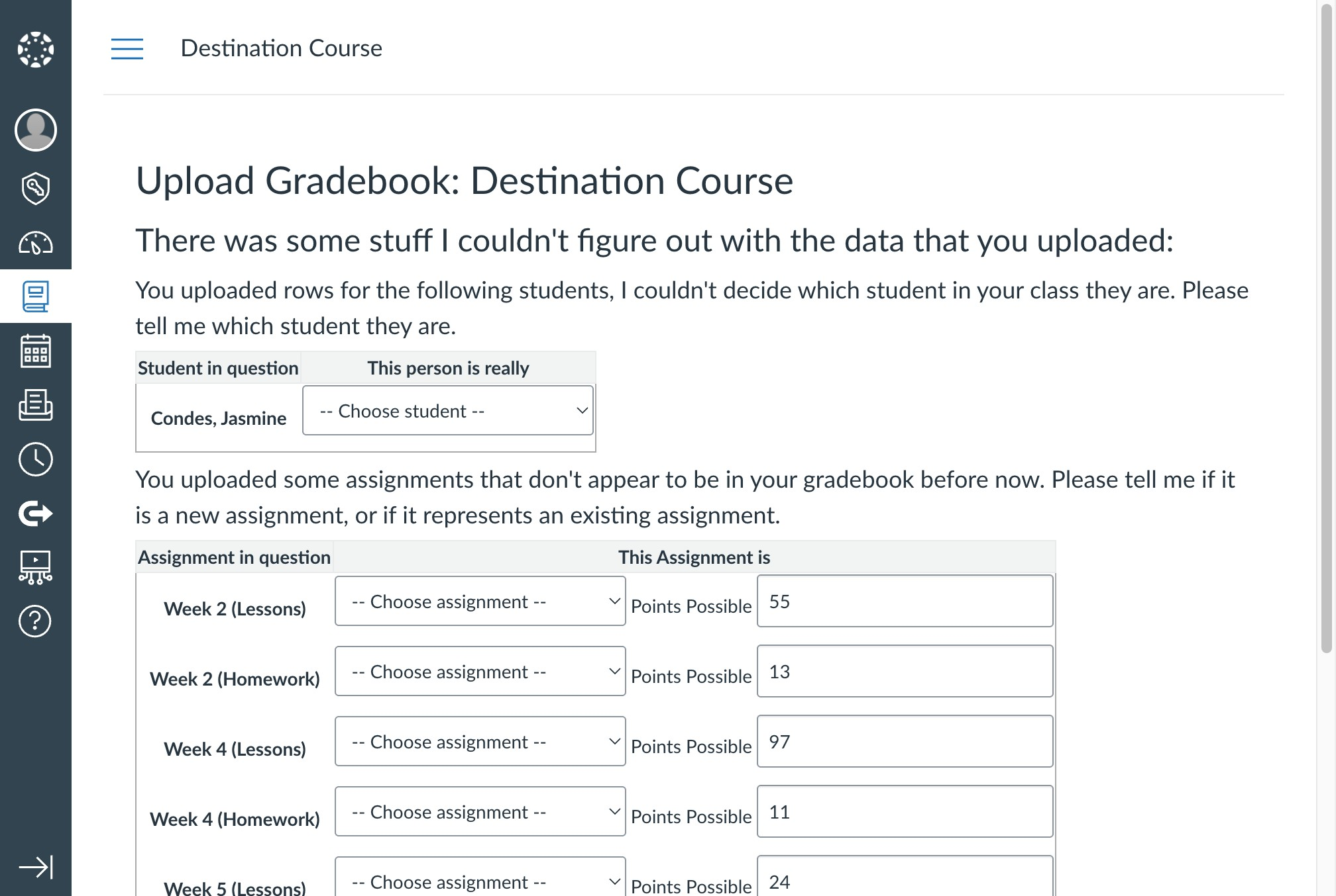 7. If a student in the export file doesn't seem to match with any students in your institution Canvas course, select the dropdown next to their name. Either match them to the correct student, or tell Canvas to ignore them.