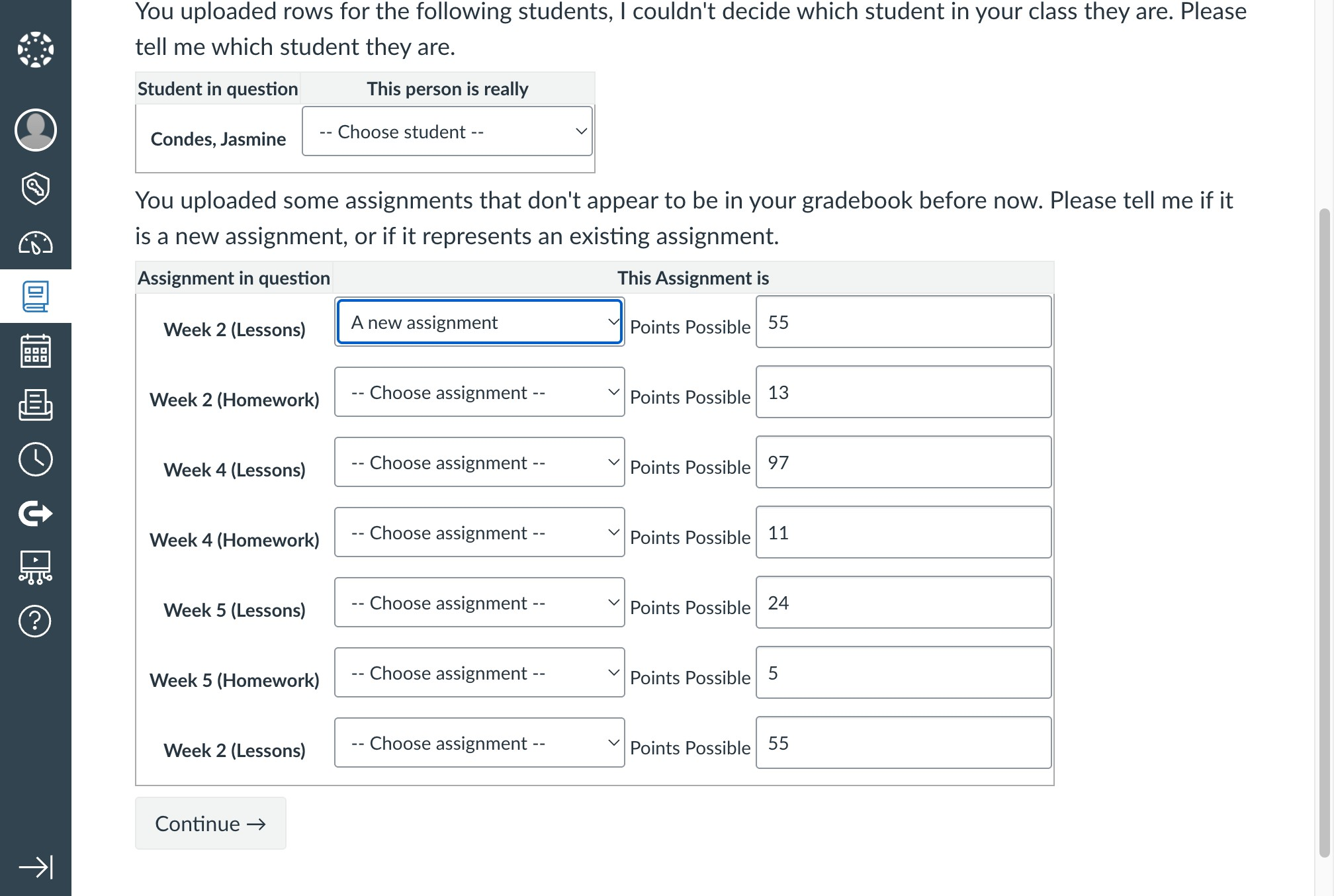 8. The first time you import grades into your institution's Canvas course, none of the Learnvia assignments will exist. From the dropdown next to each listed assignment, select "A new assignment". Canvas will create these assignments automatically for you. When you are finished, click "Continue".